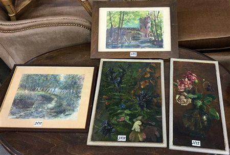Lotto composto da due dipinti ad olio e due acquerelli raffiguranti fiori e paesaggi di autori diversi