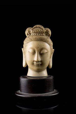 Scultura in avorio raffigurante testa di Guanyin dai lunghi lobi, base in legno