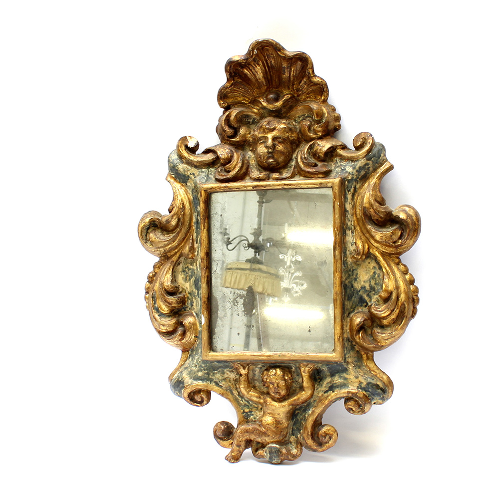 Antica specchiera di forma sagomata in legno laccato e dorato scolpito con putto, motivi vegetali e conchiglia (cm 60x42) (difetti)