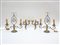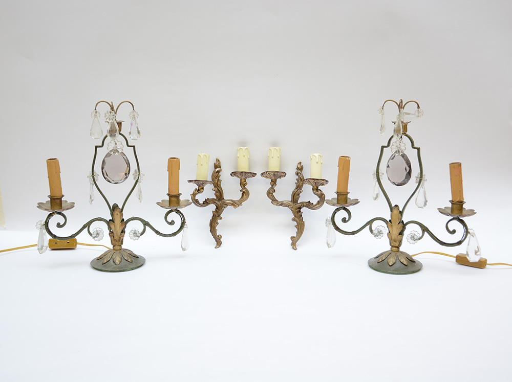 Lotto composto da una coppia di abat-jour a due luci con struttura in metallo e pendagli in cristallo e una coppia di applique a due luci in bronzo (difetti)