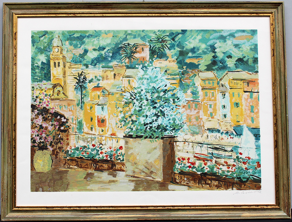 "Scorcio di Portofino" litografia (cm 60x80) firmato in basso a destra, in cornice