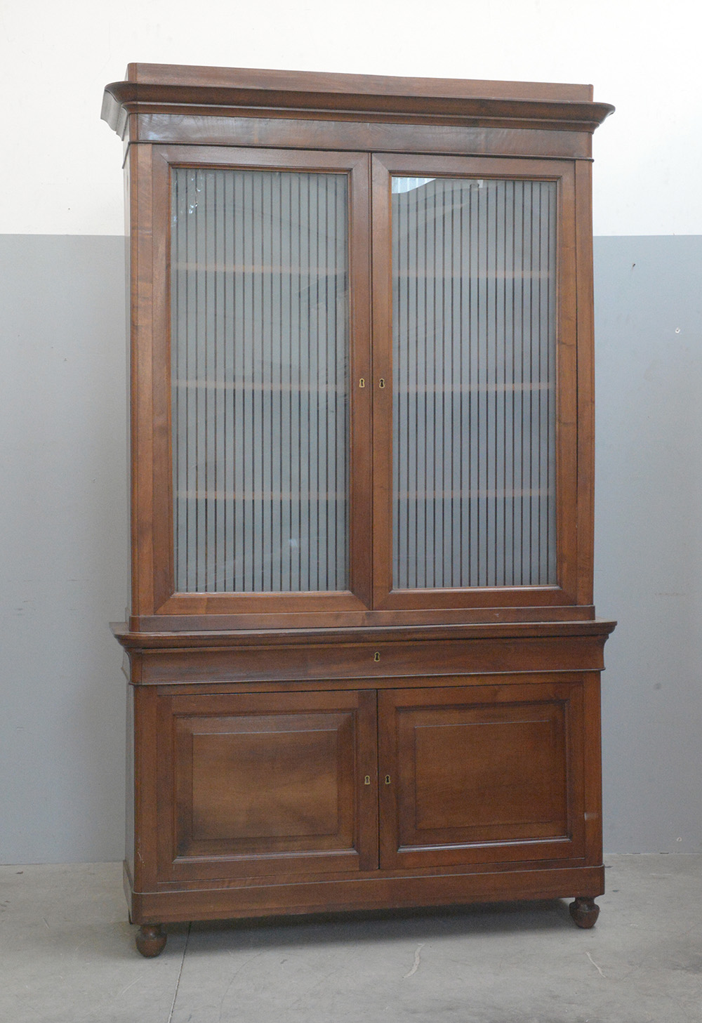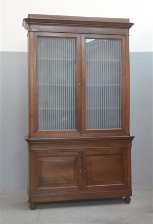 Mobile a due corpi in noce con parte superiore a due ante a vetri, parte inferiore ad un cassetto e due ante. Piedi torniti, Lombardia secolo XIX (cm 138x235x46)