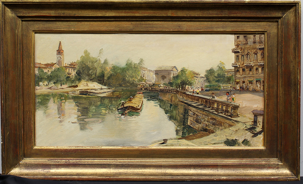 Firma indecifrata, ''Milano, scorcio del Naviglio'' olio su masonite (cm 31x62) firmato in basso a destra, in cornice