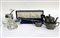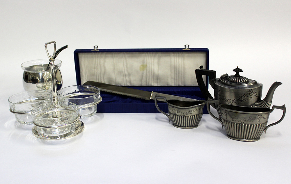 Lotto composto da un coltello da pane con custodia, un porta caviale e quattro oggetti diversi in metallo e vetro