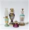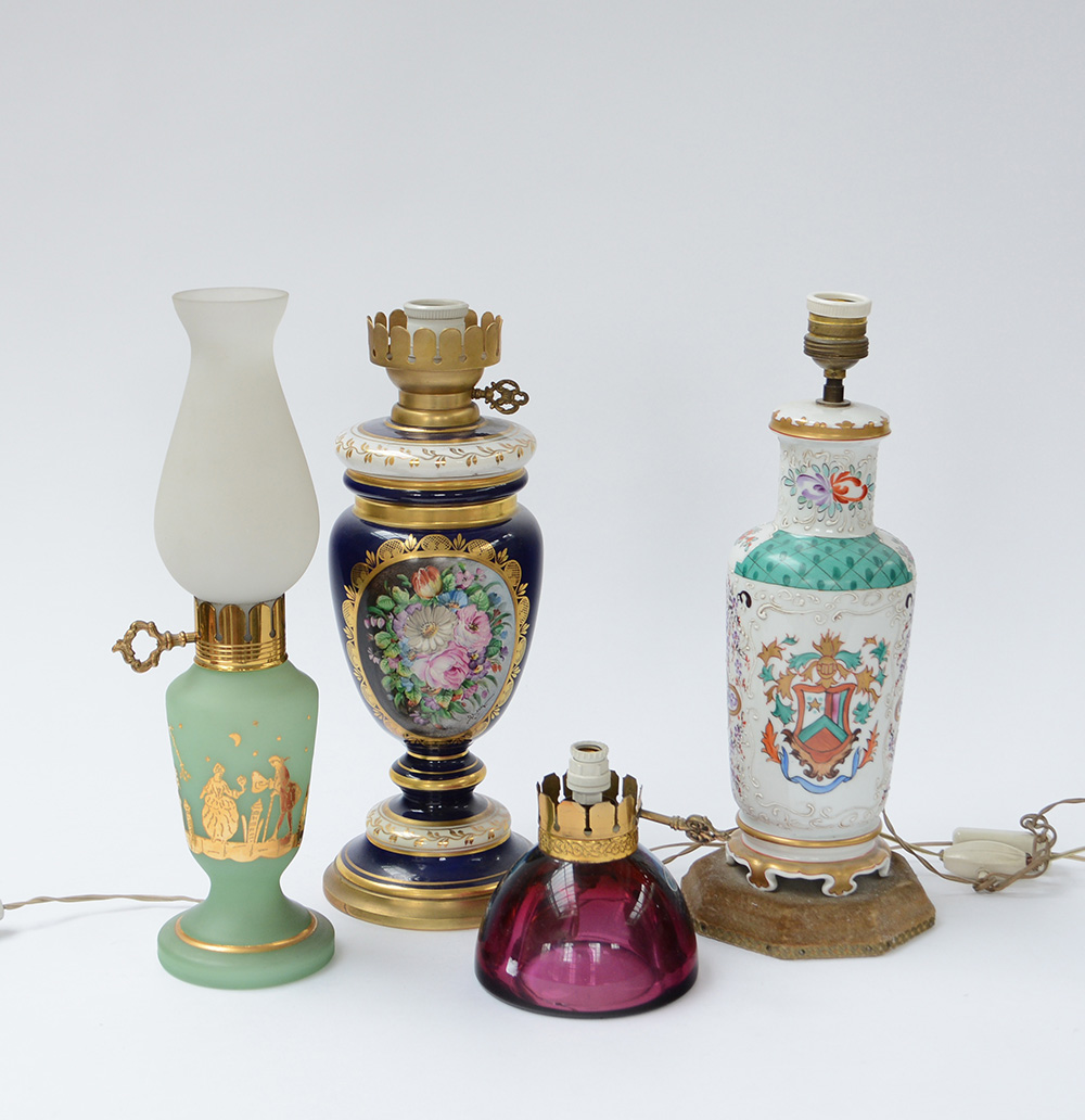Lotto composto da quattro lampade in porcellana e vetro di fatture differenti (lievi difetti)