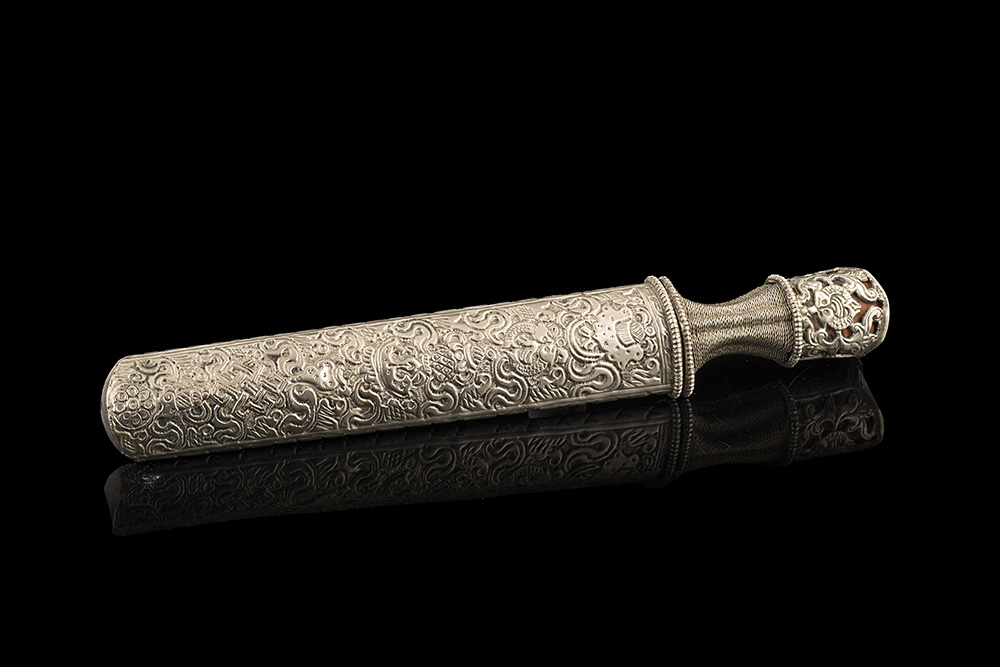 Pugnale tibetano con fodero in metallo argentato con ricchi motivi dell'oroscopo tibetano.