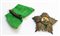 Argento traforato e diamantato. Al centro miniatura a smalto su oro del Sole e del Leone. Linee di smalto verde nella parte anteriore. Piccola rottura dello smalto e applicazione posteriore di un attacco a spilla non d'origine.