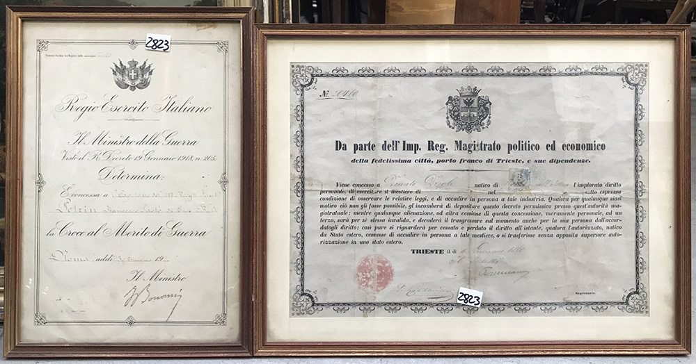 Lotto di due documenti in cornice. Il primo è un documento della città di Trieste sotto dominio asburgico, il secondo è un conferimento da parte del Regno d'Italia della croce di guerra per la prima guerra mondiale.