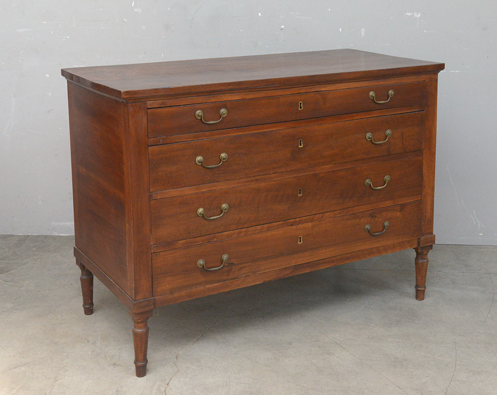 Comò in noce a quattro cassetti com gambe tornite, fine secolo XIX (cm 122x93x52)