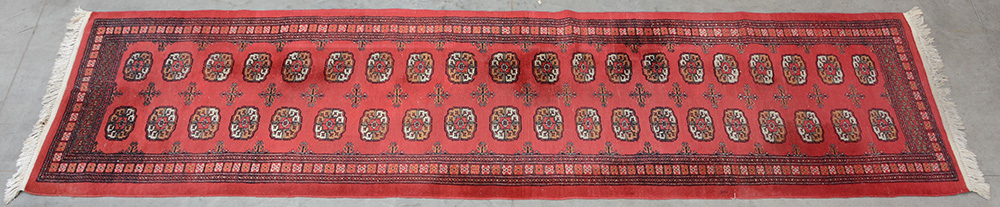 Tappeto passatoia Bouhkara Pakistan, sec. XX, decorata con due file di Gul su fondo rosso (cm 375x200) (difetti)