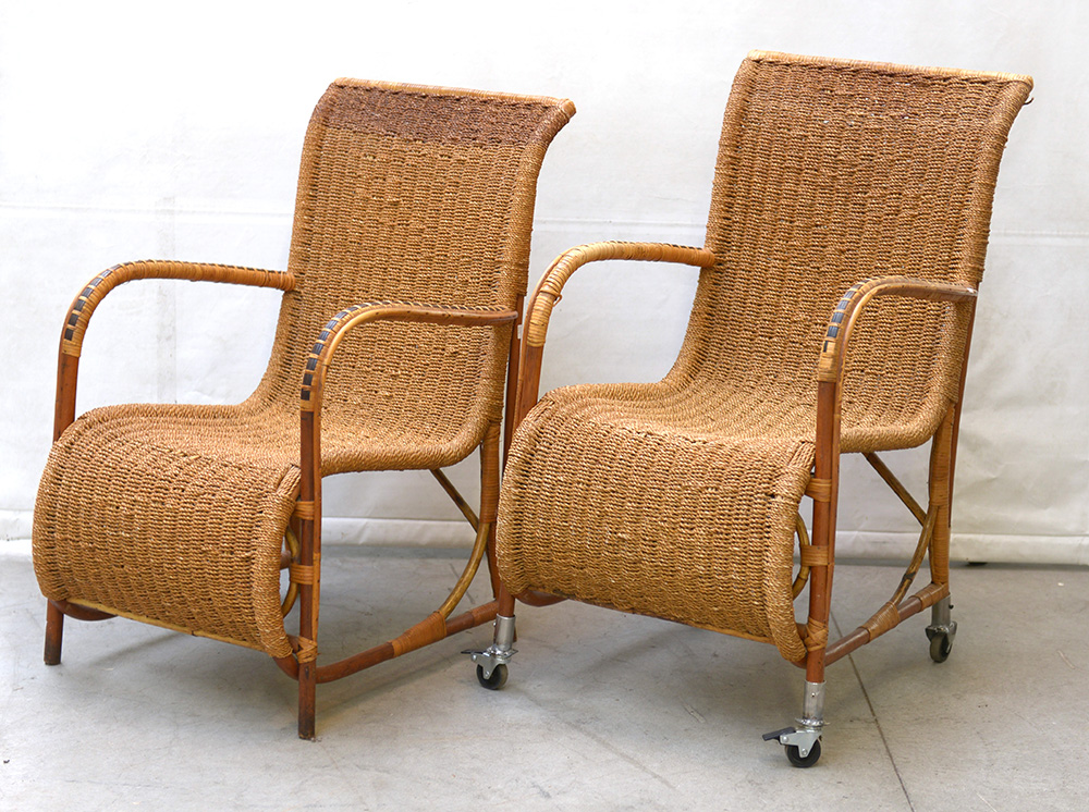 Lotto 2860 | Coppia di poltrone in vimini, una dotate di rotelle in epoca posteriore...