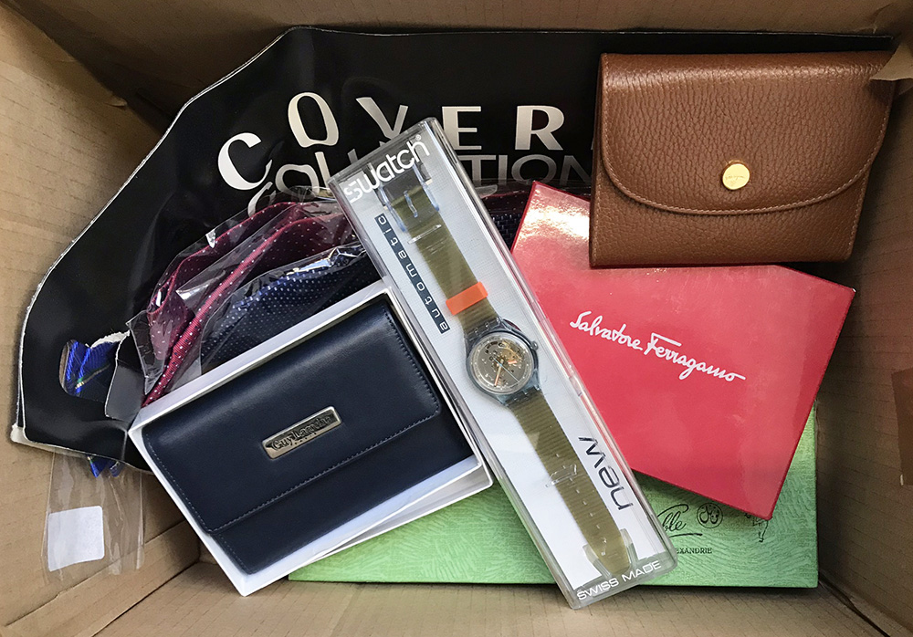 Lotto composto da tre cravatte, un farfallino, due portafogli e un orologio...