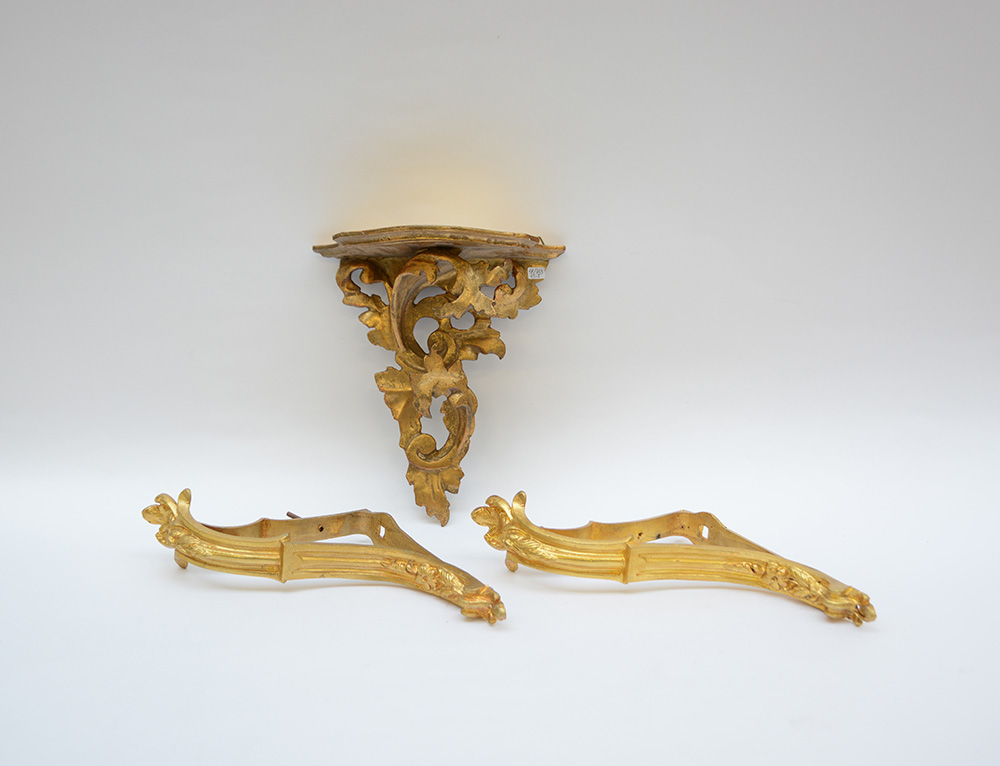 Lotto composto da una piccola mensola in legno intagliato a volute e due sostegni in metallo dorato (lievi difetti)