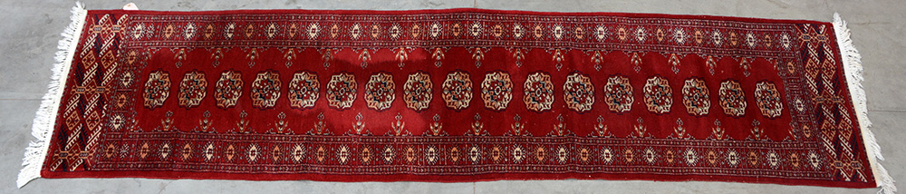 Tappeto passatoia Bouhkara Pakistan, sec. XX, decorata con una fila Gul su fondo rosso (cm 310x80) (difetti)
