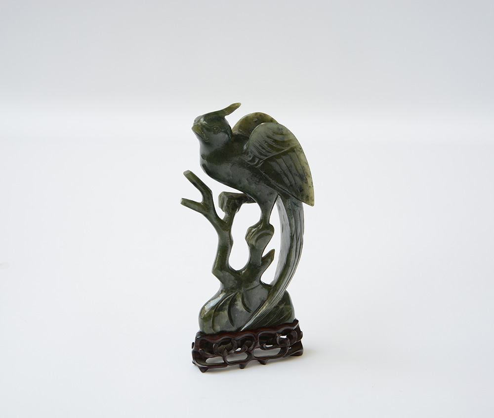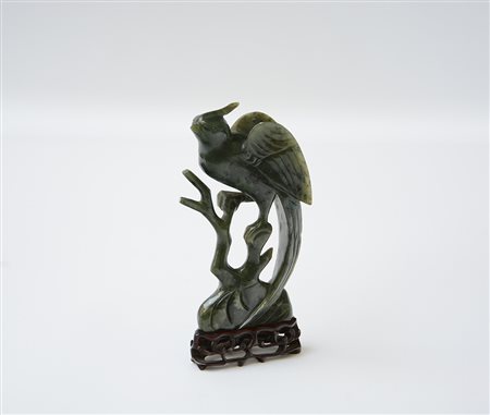 Scultura in giada color spinacio raffigurante volatile dalla lunga coda, basamento in legno (h cm 15) (difetti)