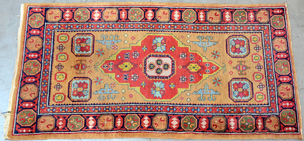 Tappeto Samarcanda, Turkestan orientale secolo XX, disegno a medaglione rosso su campo giallo zafferano (cm 180x93) (difetti)