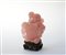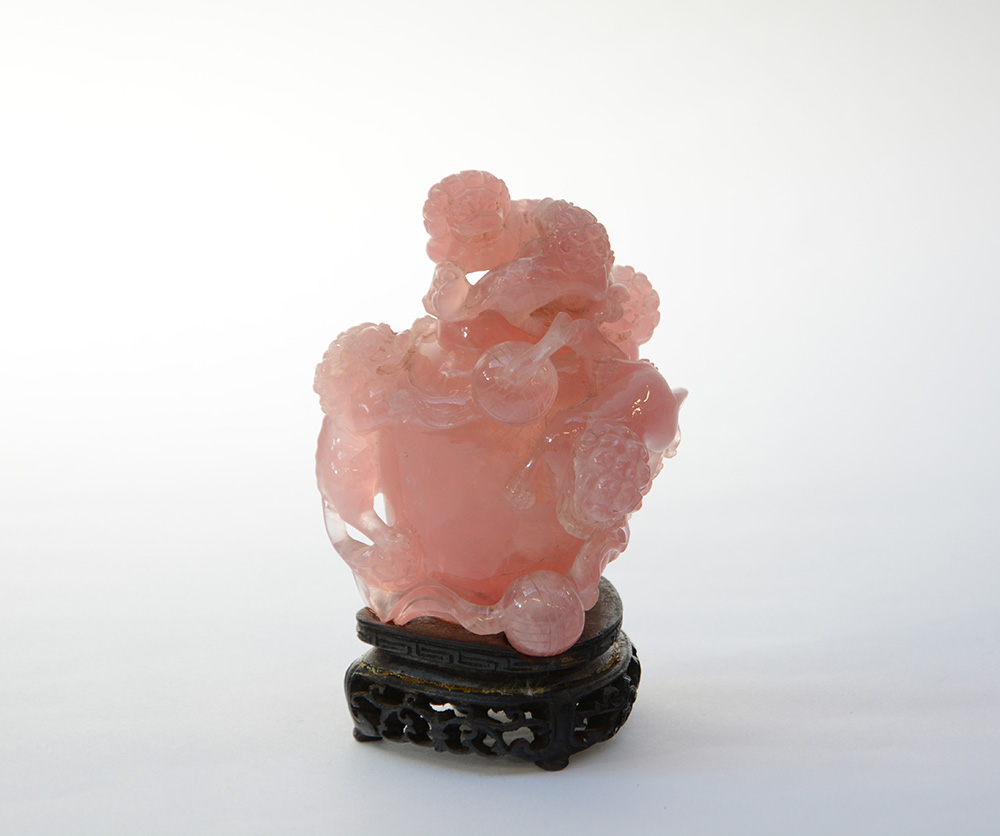 Vasetto con coperchio in quarzo rosa scolpito con cinque leoni buddisti con palle di broccato, basamento in legno (h. cm. 19,5)