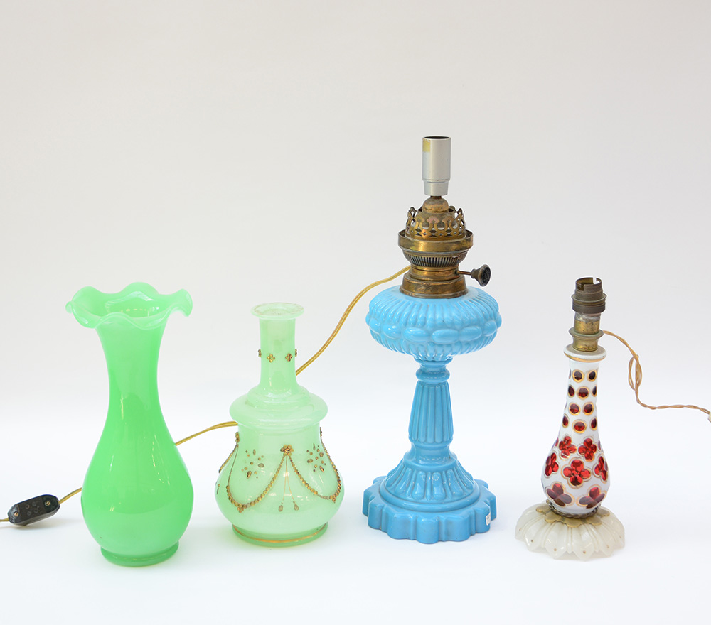 Lotto composto da una lampada da tavolo e due vasetti in opaline uniti ad una lampada da tavolo in vetro incamiciato (difetti)