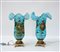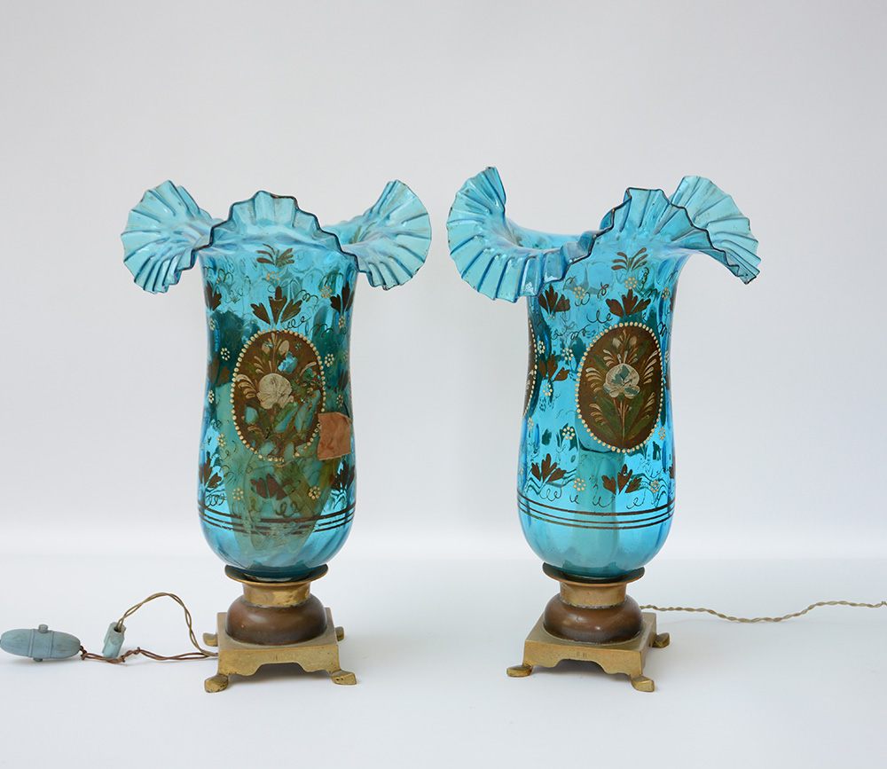 Coppia di lampade da tavolo con diffusori in vetro blu con apertura a fazzoletto (h cm 37) (difetti)