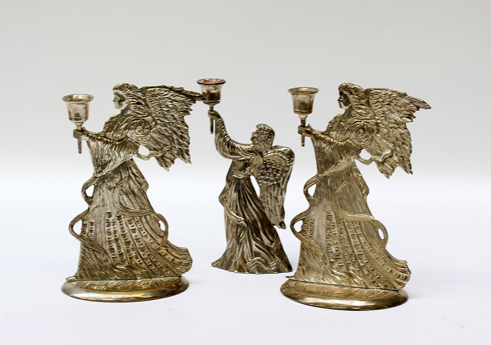 Lotto di tre candelieri in metallo a forma di angeli (h max cm 23) (lievi difetti)