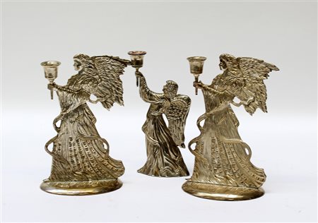 Lotto di tre candelieri in metallo a forma di angeli (h max cm 23) (lievi...