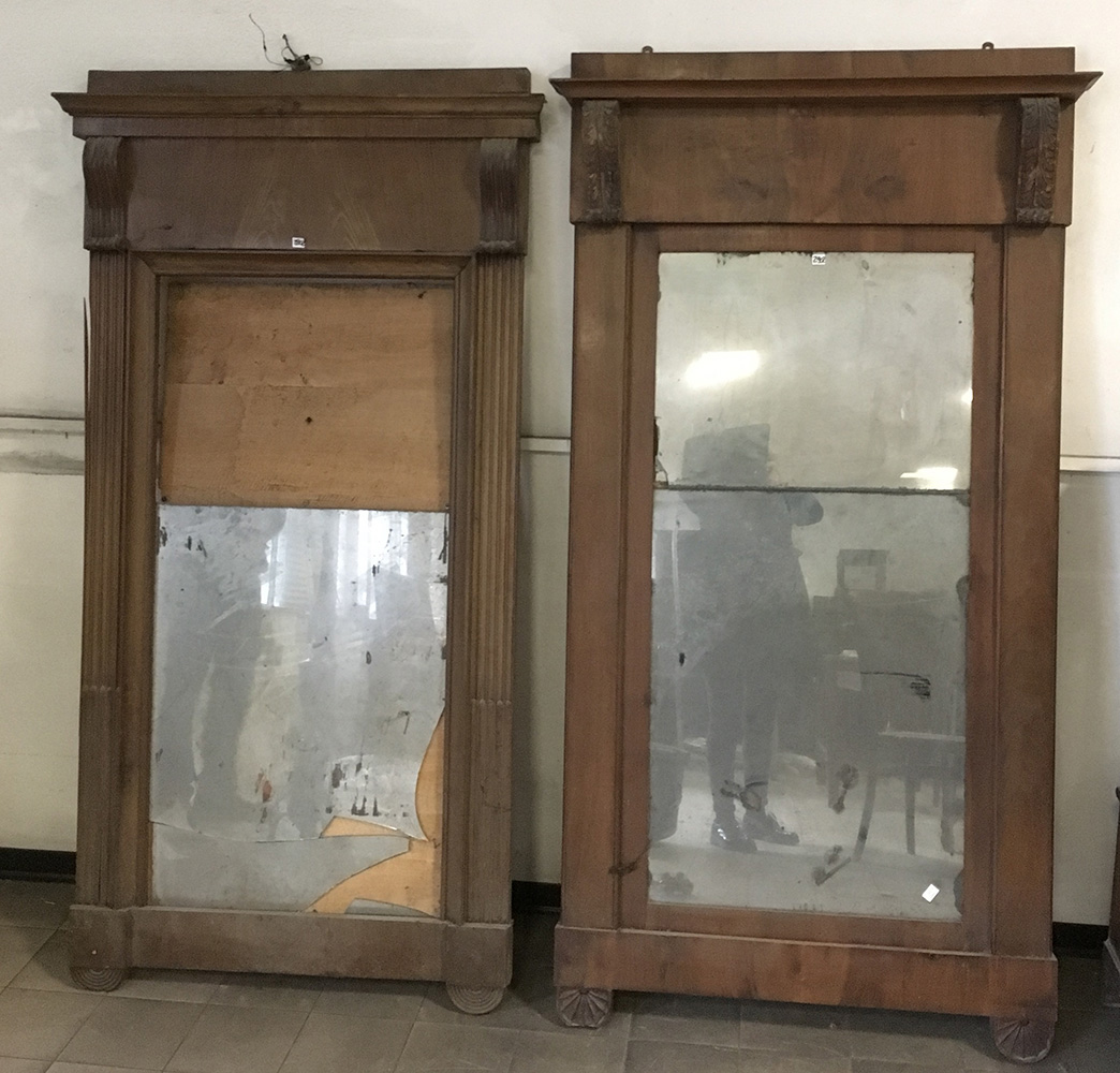 Due specchiere in stile Impero decorate con elementi architettonici intagliati (h. cm 177) (mancanze)