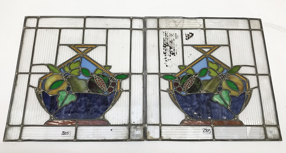 Coppia di composizioni a mosaico di vetri policromi legati a piombo raffiguranti canestre di frutta (cm 44x45) (difetti)