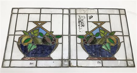Coppia di composizioni a mosaico di vetri policromi legati a piombo...