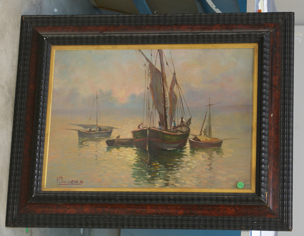 "Pesca al tramonto nell’adriatico" olio su cartone pressato (cm 50x70) in cornice. Firmato e datato G. Amadori ‘31 in basso a sinistra e iscritto "Senigallia" al retro