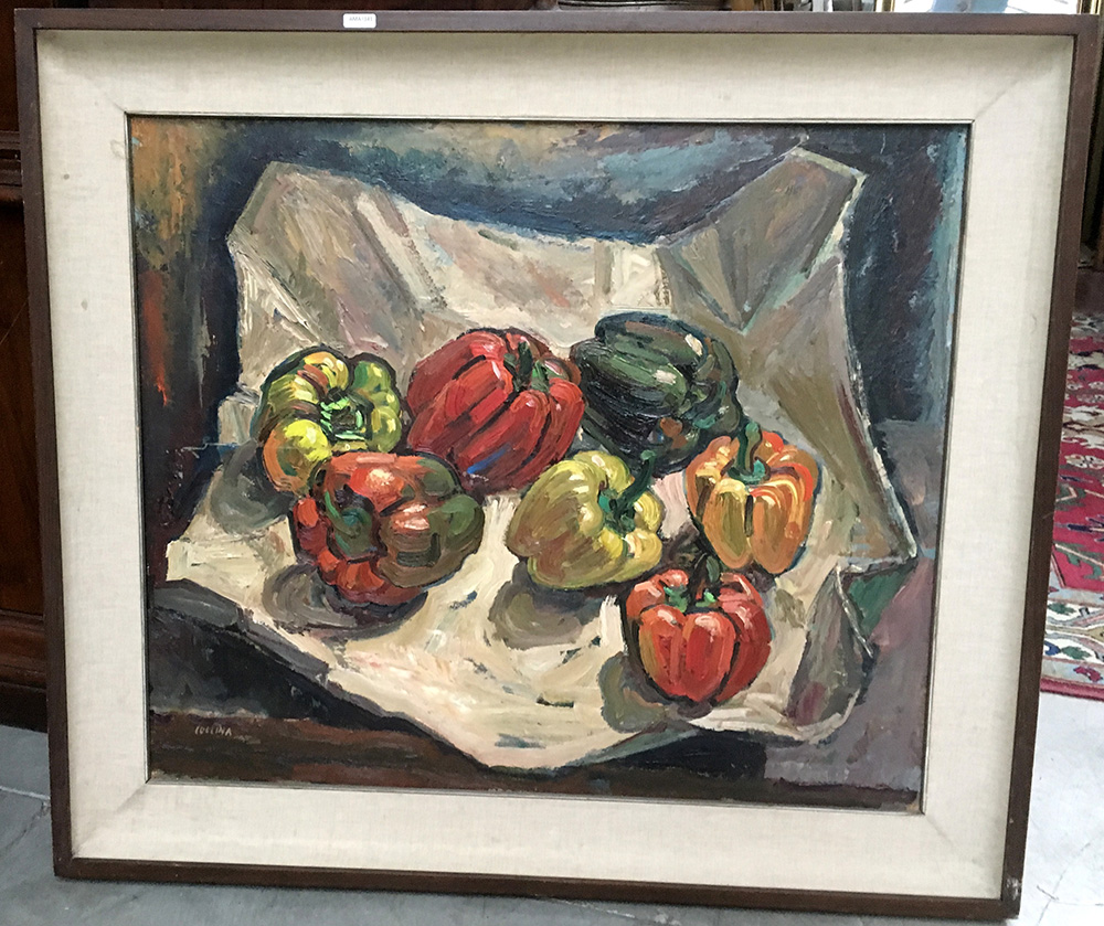 "Cartoccio di peperoni" olio su tavola (cm 60x70) firmato in basso a sinistra, in cornice (lievi difetti)