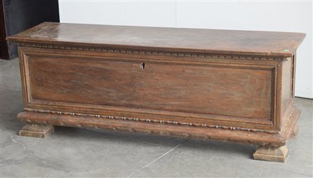 Antica cassapanca in noce con fronte e fianchi riquadrati e a fasce intagliate. Piedi a mensola (cm 148,5x54x45) (difetti)