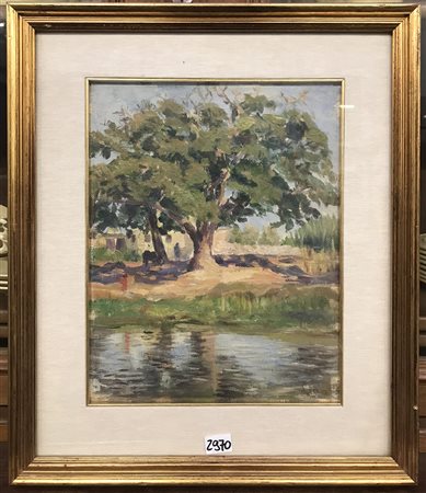 Firma indecifrata, “Scorcio lacustre”, olio su tela (cm 34x27) firmato in basso a destra, in cornice (lievi difetti)