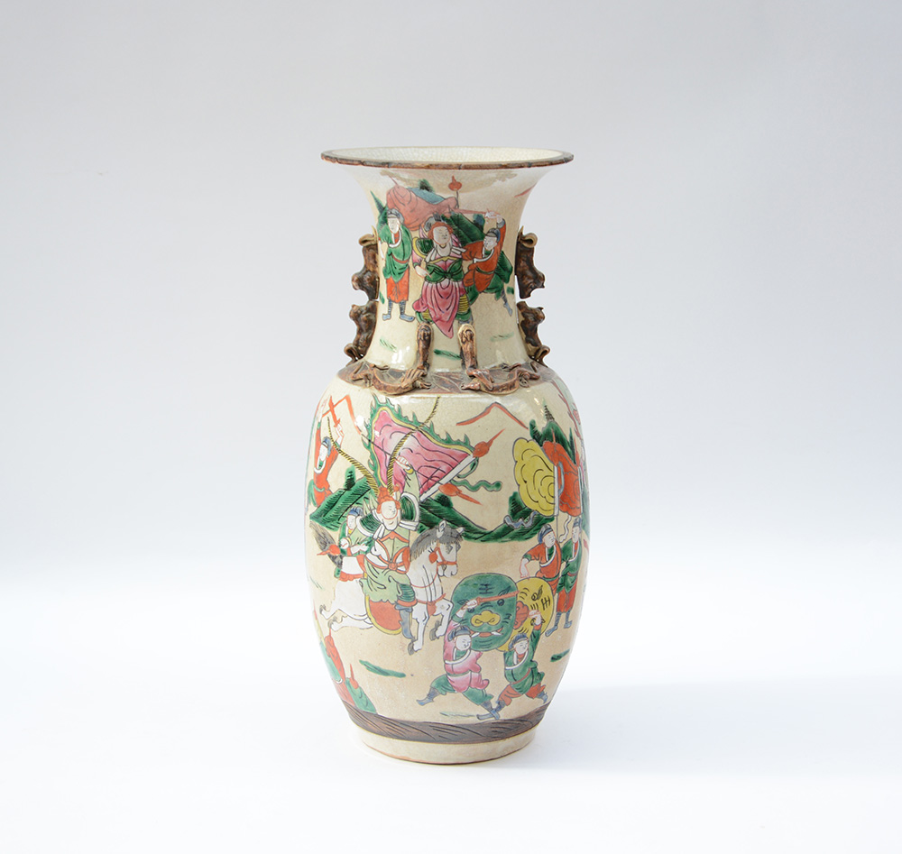 Vaso a balaustro in porcellana policroma su fondo craquelé decorato con scena di battaglia. Cina, sec. XX (h cm 44) (lievi difetti)