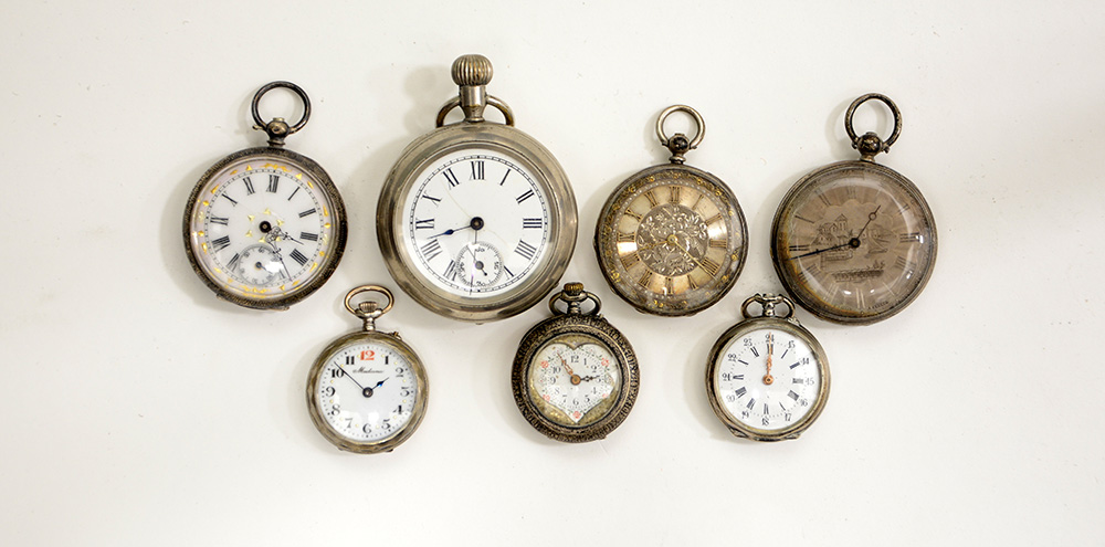 Lotto composto da sette orologi da tasca da uomo in argento e metallo, con carica a chiavetta e remontoire, misure ed epoche diverse (difetti)