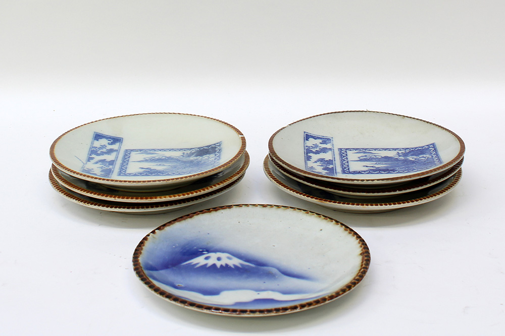 Sette piatti in porcellana di cui sei decorati con scene di paesaggi in pannelli e uno con il monte Fuji (d cm 22)(difetti)