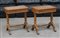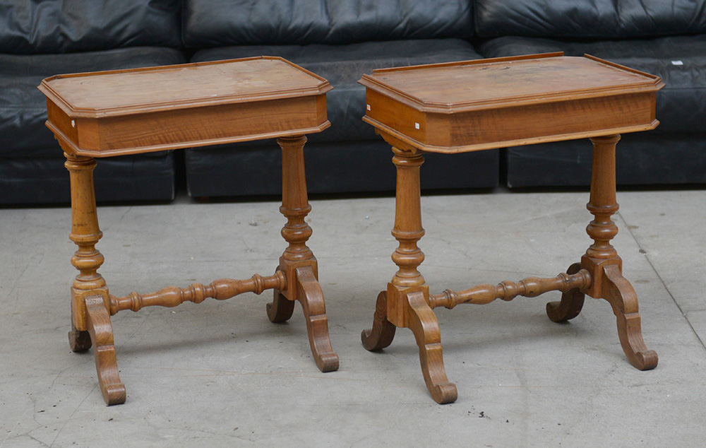 Coppia di tavolini in legno chiaro con cassetti nella fascia, gambe tornite con traverse (cm 56x63x40) (difetti e mancanze)