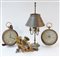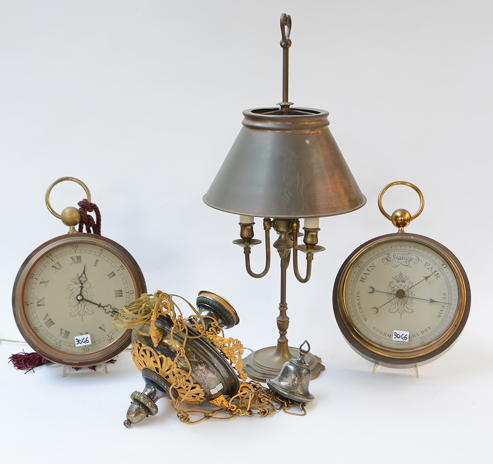 Lotto composto da una lampada in bronzo a tre fiamme, una lampada votiva, un orologio e un barometro con cassa in legno e ganci ad anello (difetti)