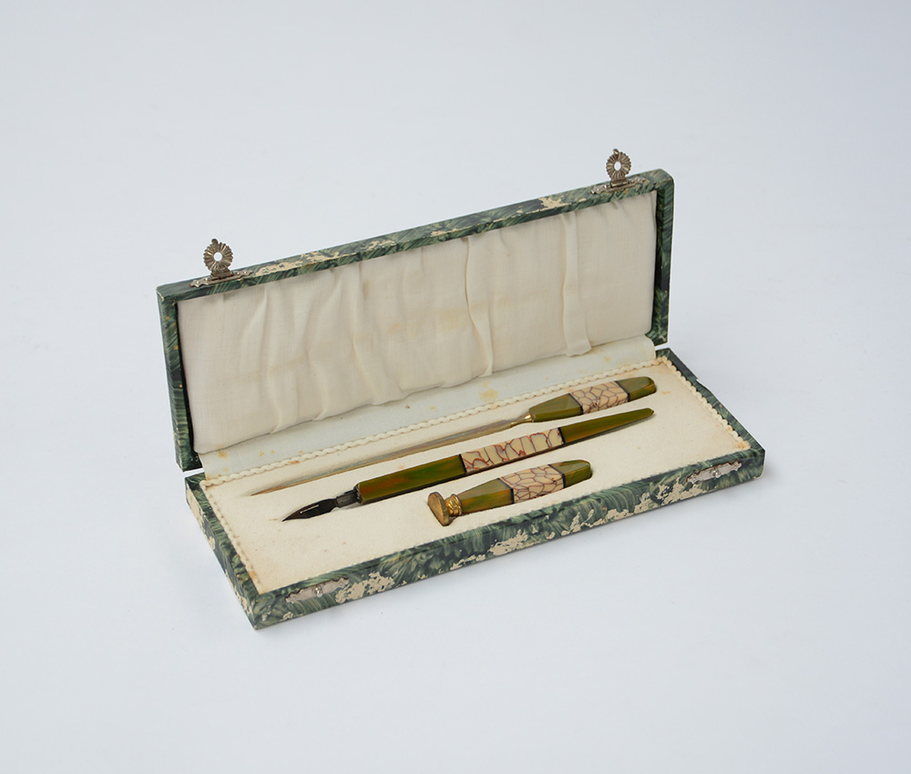 Lotto 3057 | Set da scrivania composto da pennino, timbro e tagliacarte in astuccio (difetti)
