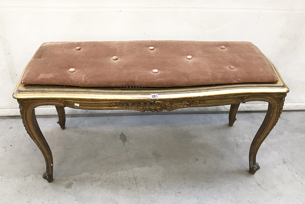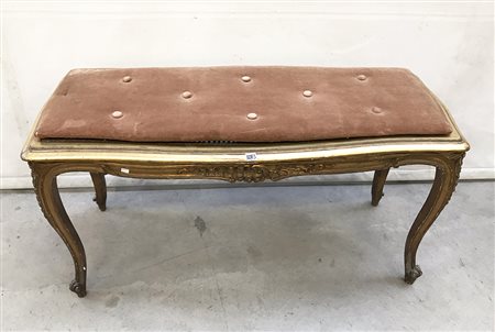Panchetto di forma mossa in legno e dorato con seduta incannucciata (cm 102x51x40) (difetti)