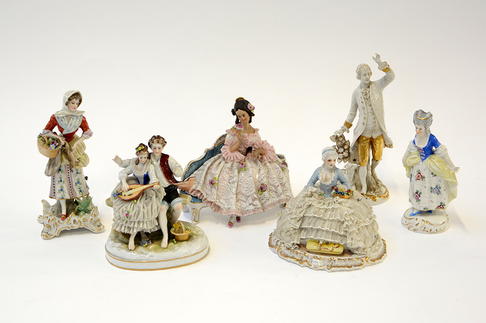 Lotto composto da sei sculture in porcellana raffiguranti dame e cavalieri, manifatture differenti (h. max cm 20) (difetti)