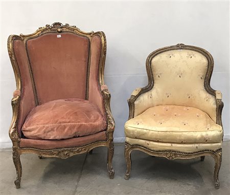 Lotto di due bergere in legno intagliato con rivestimento in tessuto a fiori e color salmone, fatture differenti (difetti)