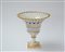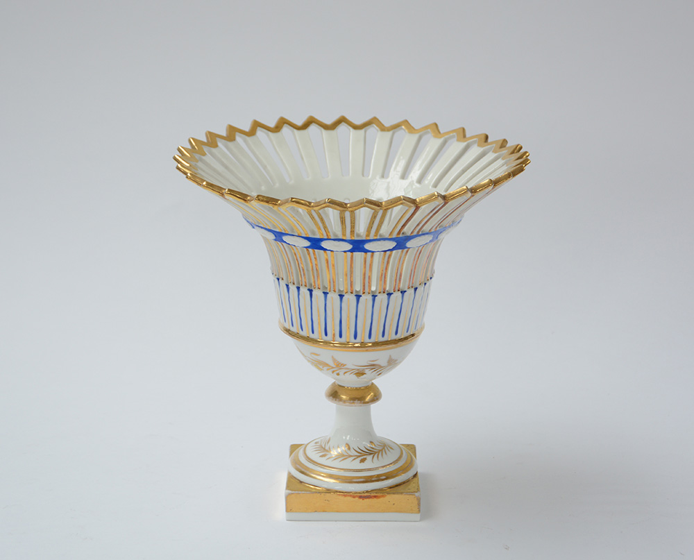 Alzata in porcellana a decoro blu e oro con tesa canestrata (h. cm 26 x d. cm 25) (lievi difetti)