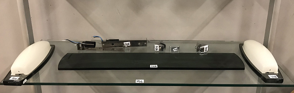 Fornitura da bagno in vetro grigio e opalino composta da due appliques, una mensola e uno specchio. (difetti)