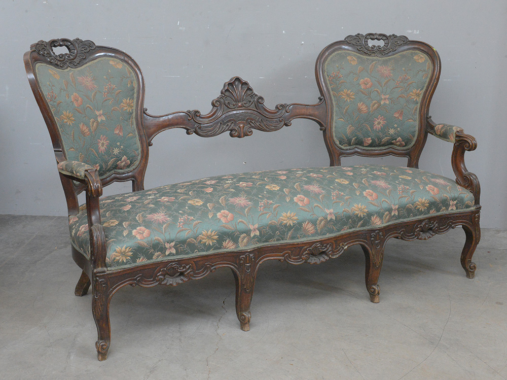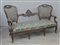 Divano in noce a due posti con montanti e cimase intagliate a volute, secolo XIX
