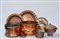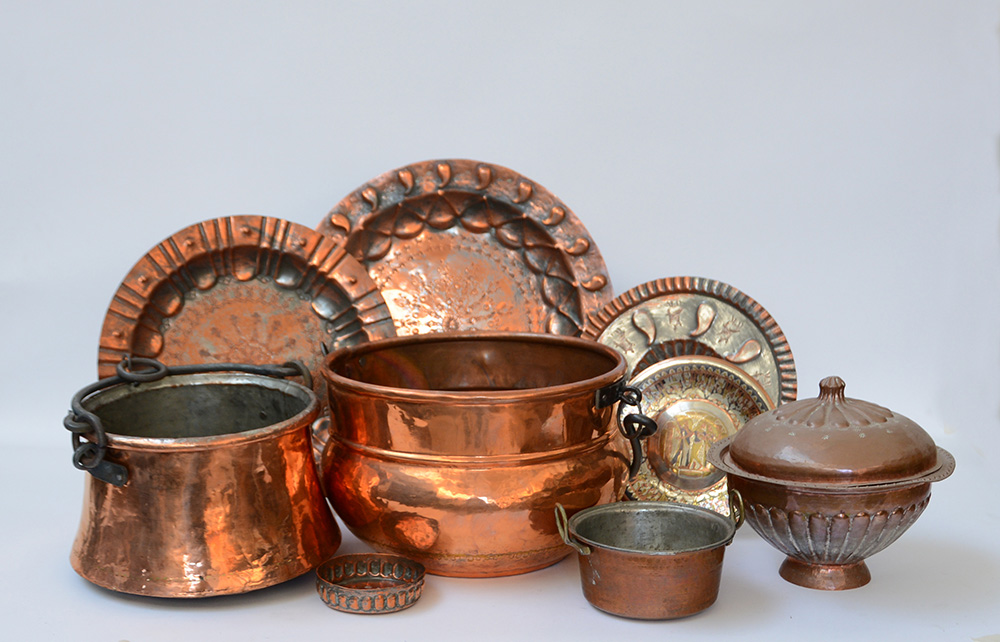 Lotto composto da tre vassoi e alcuna pignatte in rame (difetti)