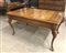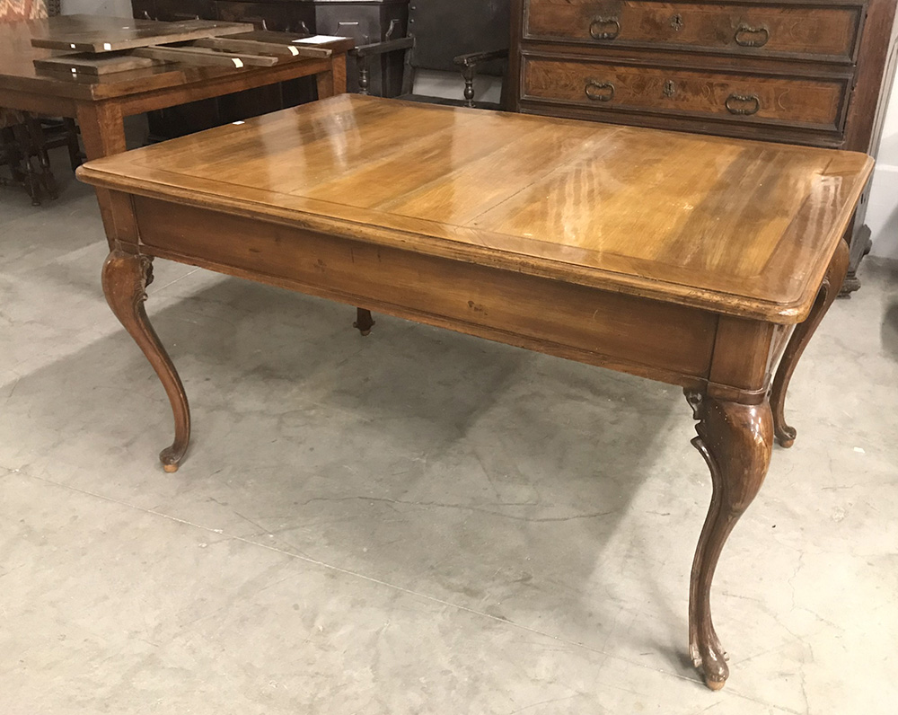 Tavolo da pranzo rettangolare in noce con gambe mosse e intagliate, due cassetti nella fascia, cui si uniscono due prolunghe. Fine secolo XIX (cm 150x80x103) (difetti)