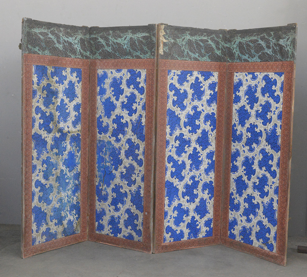 Separè a quattro ante decorate in carta, secolo XIX (cm 240x172) (gravi difetti e mancanze)