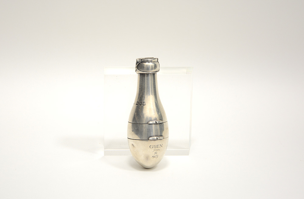 Trousse a forma di fiasca in argento a corpo liscio con boccetta porta profumo sulla parte superiore e portacipria e sali nella parte inferiore. Interni in vermeille. Inscritta "Guen from R" 1923. Punzoni inglesi