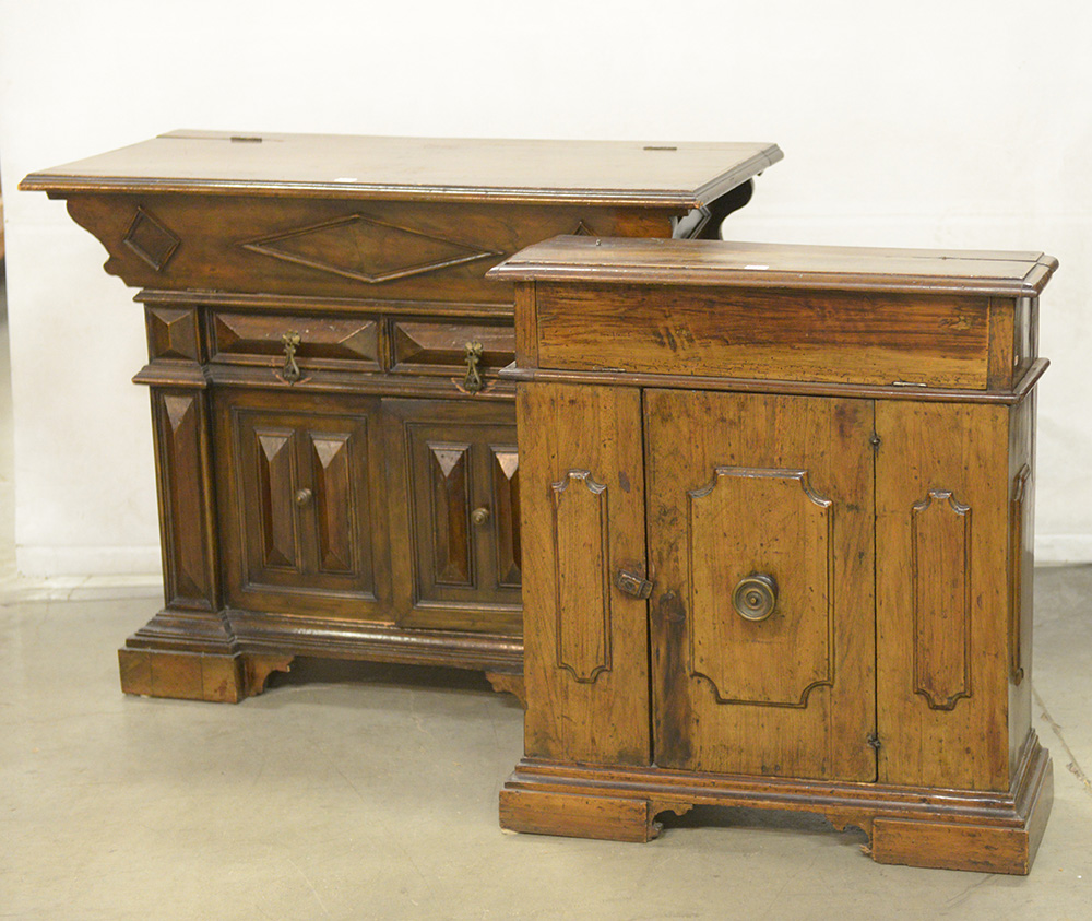 Lotto di due mobiletti in legno a tinta scura con decoro a bugne con piani sollevabili (difetti)