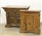 Lotto di due mobiletti in legno a tinta scura con decoro a bugne con piani...